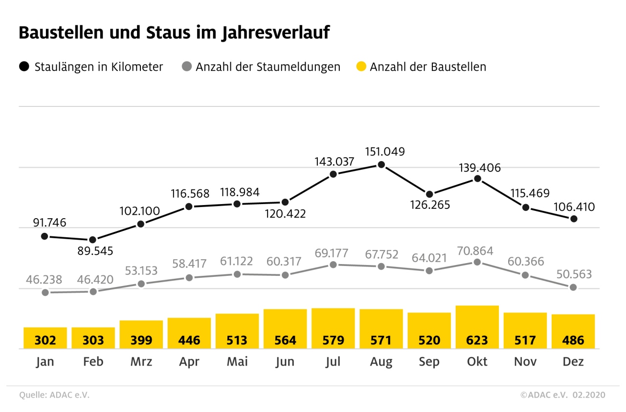 Autofahrer, die 2020 weniger häufig im Stau stehen und ihre Fahrt individuell planen wollen, können sich vor Fahrtantritt auf der adac.de über die aktuelle Verkehrslage und die Baustellensituation informieren. Der ADAC spricht sich für den weiteren Ausbau des ÖPNV zur Erhöhung der Leistungsfähigkeit aus, um vor allem im Berufsverkehr Entlastung zu schaffen. Auch die Modernisierung der Schienensysteme im Nah- und Fernverkehr muss konsequent vorangetrieben werden, um so die Kapazitäten und die Zuverlässigkeit zu steigern, mit dem Ziel, mehr Autofahrer zum Umstieg auf den ÖPNV zu bewegen. (ADAC)