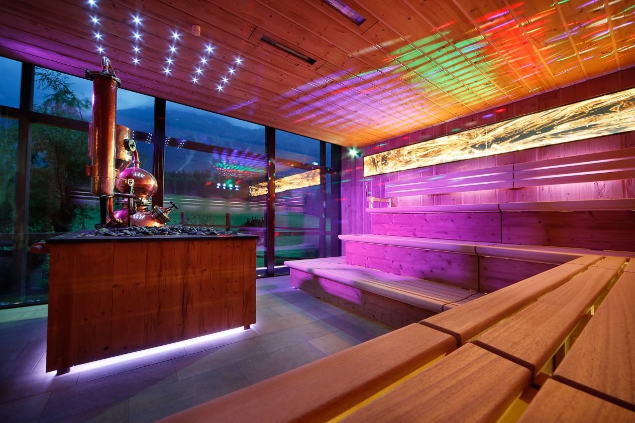 Neben den Grappaverkostungen und den vielen Wellness-Möglichkeiten, die der Gassenhof bietet, hat das Erlebnishotel aber noch ein ganz besonderes Highlight: eine große Sauna mit historischem Schnapsbrennofen aus Kupfer und dank Glasfront gigantischem Panoramablick auf die Ridnauner Berge. Ein weiterer Clou ist das hochprozentige Aufgussritual – hier wird mindestens einmal wöchentlich oder auf Wunsch auch öfter ein Aufguss mit Grappa zelebriert.