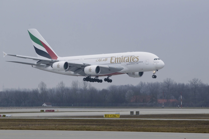 Das Emirates Flagschiff, der Airbus A380, landet auf dem Flughafen in München. Bild: Emirates.