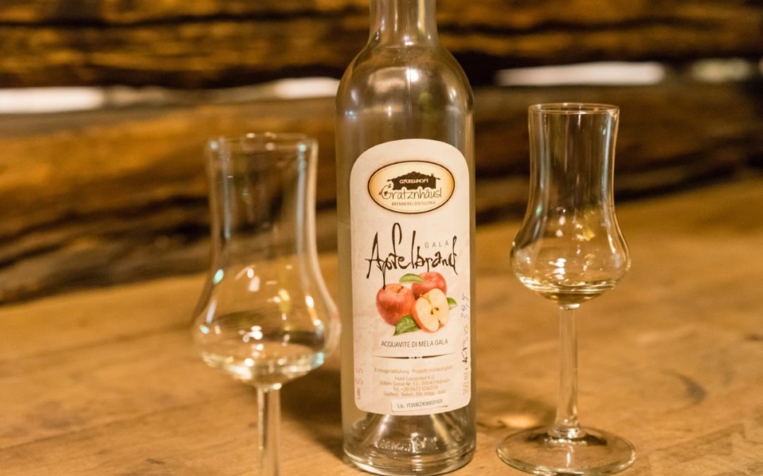 Selbstgebrannter Apfelgrappa aus dem Hotel Gassenhof. Im Gratznhäusl brennt der Hausherr, Manfred Volgger, seine köstlichen Grappa-Sorten. Bild: (c) Hotel Gassenhof.