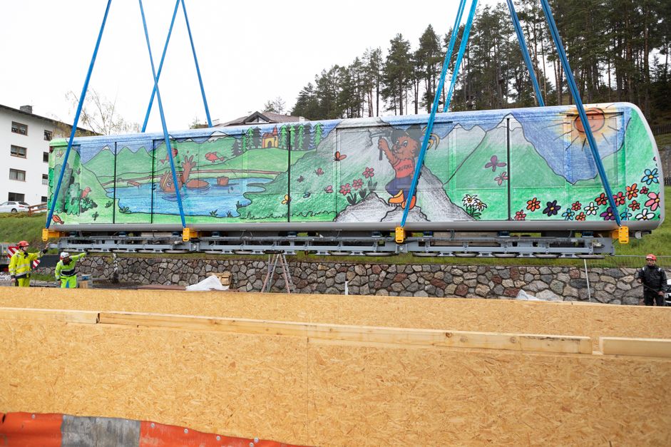 Die neuen Waggons für die Serfauser U-Bahn werden eingehoben. Bild: Seilbahn Komperdell.