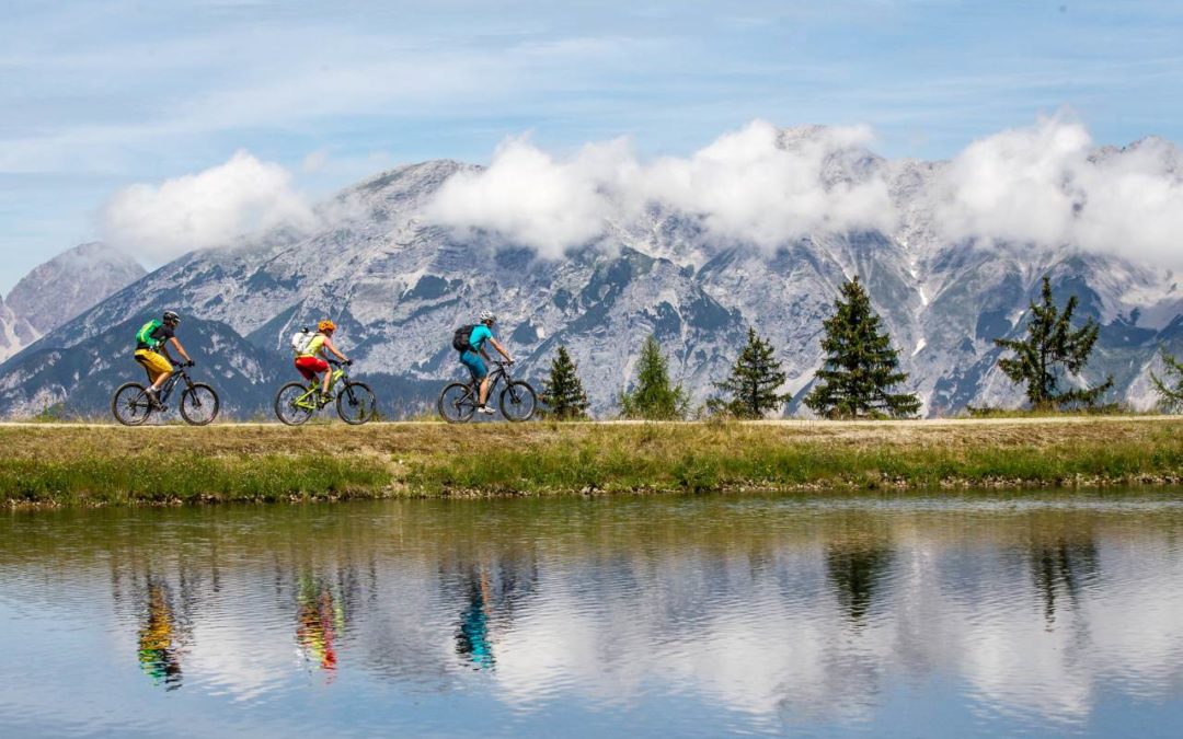 Gruppe von E-Mountainbikern vor der Kulisse der Tiroler Berge. Bild: ©Erwin Haiden, bikeboard.