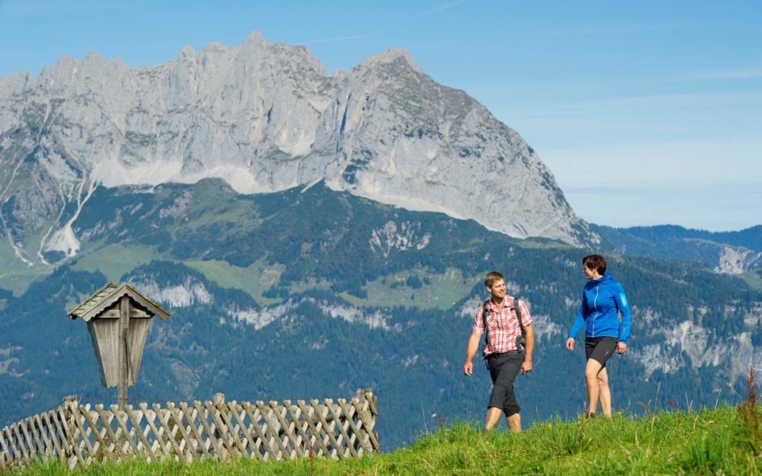 Zwei Wanderer auf dem KAT Walk, im Hintergrund der Wilde Kaiser. Bild: Franz Gerdl.