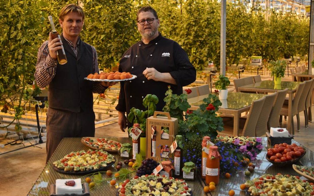 Knútur Ármann (Besitzer, links) und Jón K.B. Sigfússon (Friðheimar Restaurantchef) präsentieren ihre Produkte. Bild: (c) Jón K.B. Sigfússon.
