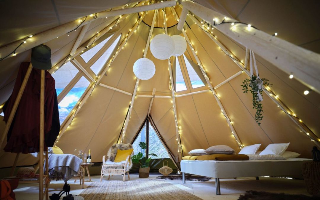 Modernes Glamping-Zelt in denAusstellungsräumen von Schloss Egeskov. Bild: © Destination Fyn Egeskov