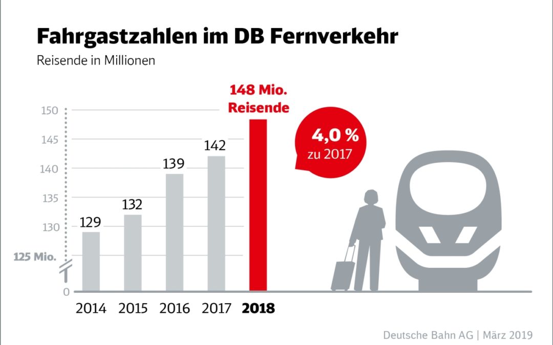Im Vergleich zu 2017 legten die Fahrgastzahlen im DB Fernverkehr um sechs Millionen Fahrgäste bzw. vier Prozent zu. Bild: DB AG.