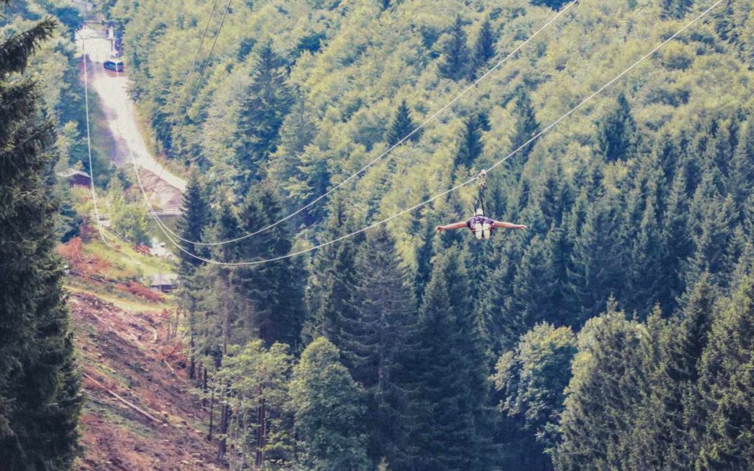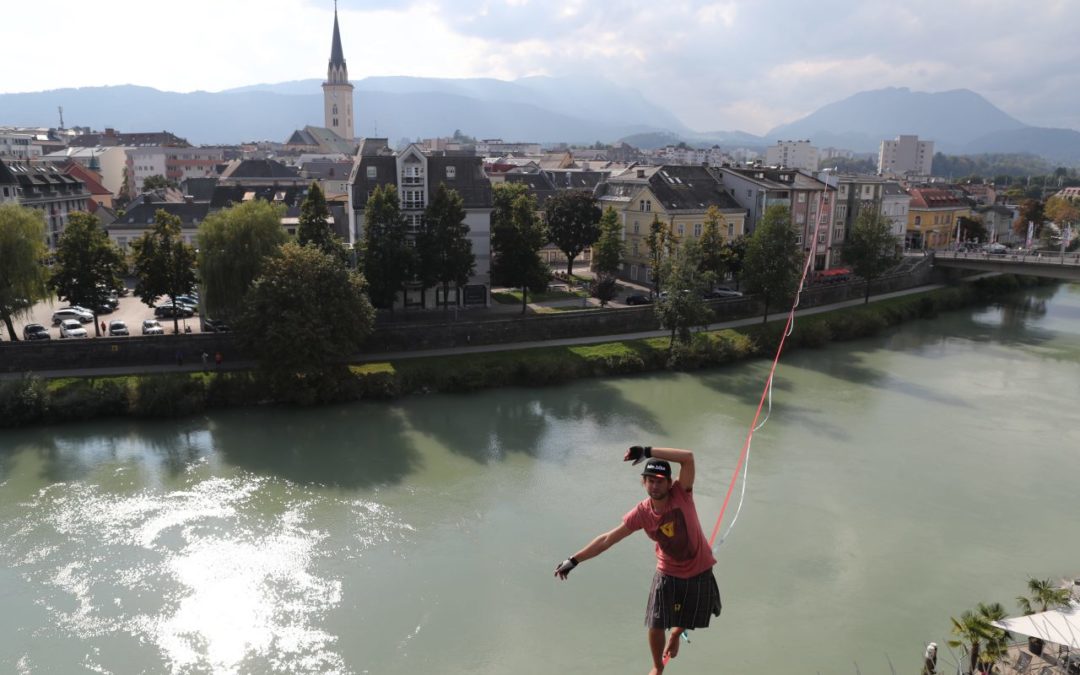 Alex Schulz beim Versuch den Weltrekord für die längste Strecke auf der Slackline über den Dächern Villachs und der Drau zu knacken. Bild: (C) Kletterhalle Villach.