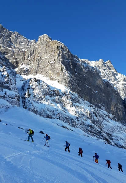 Ins Gelände – aber sicher! Im Rahmen der dreitägigen "Snow & Safety Days" in Engelberg/Zentralschweiz unternehmen die Teilnehmer stets eine geführte Skitour. Bild: Engelberg-Titlis Tourismus.