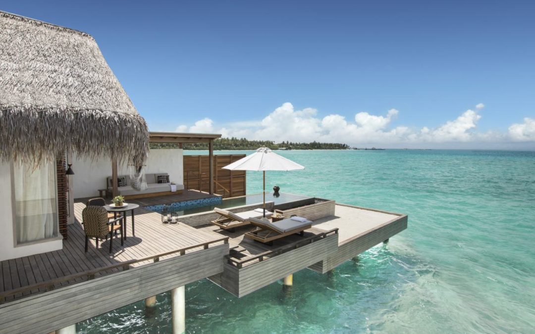 Die Wasser Villen stehen im typischen Stil der Malediven auf Stelzen direkt im Wasser. Bild: Fairmont Maldives Sirru Fen Fushi.