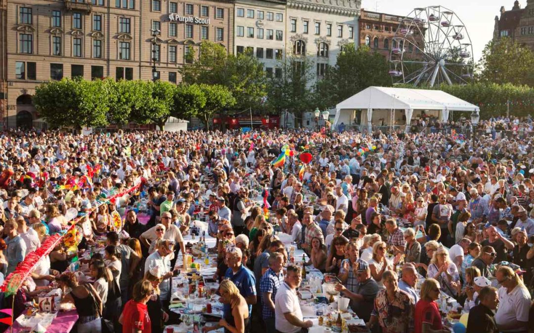 Die „Kräftskiva“ für alle auf dem Platz Stortorget in Malmö ist immer gut besucht. Bild: Johan Bävman.