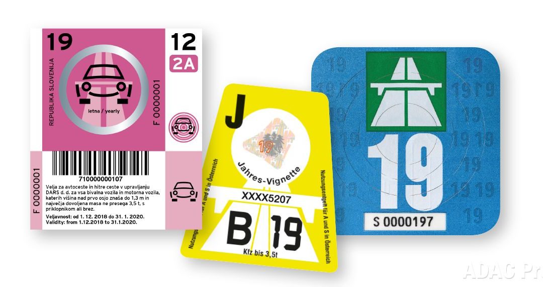 Die neuen Vignetten 2019 für Slowenien, Österreich und die Schweiz. Bild: ADAC.