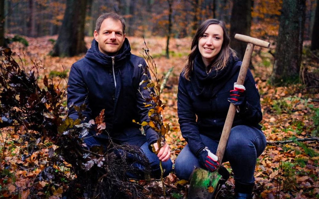 Jan Muntendorf, Projektmanagement Stiftung Unternehmen Wald, und Barbara Kurz, Product Managerin Holiday Extras pflanzen die ersten Setzlinge. Bild: Holiday Extras.