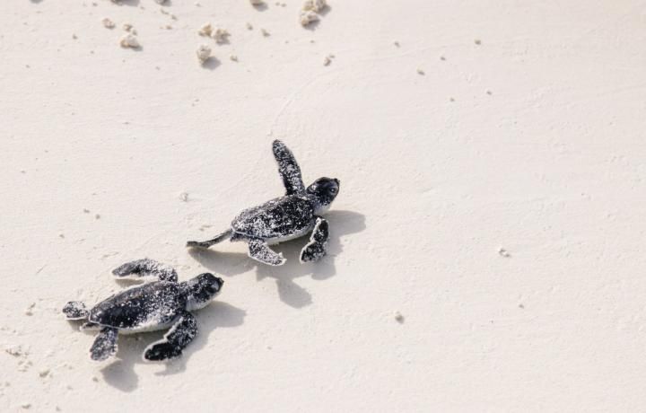 Frisch geschlüpfte Schildkrötenbabys am Strand des Kanuhura Resorts auf ihrem Weg zum Meer. Bild: (c) Kanuhura Resort.