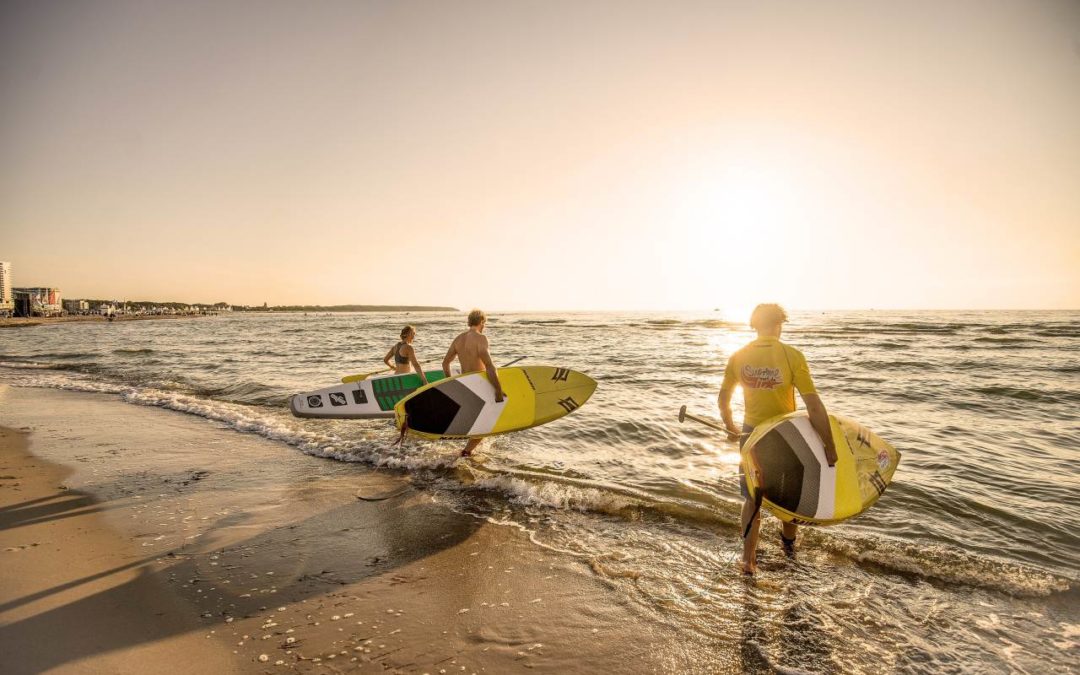 Am Strand des Ostseebades Warnemünde bringen sich Surfer und Stand-up-Paddler in Position. Bild: TMV/Krauss.
