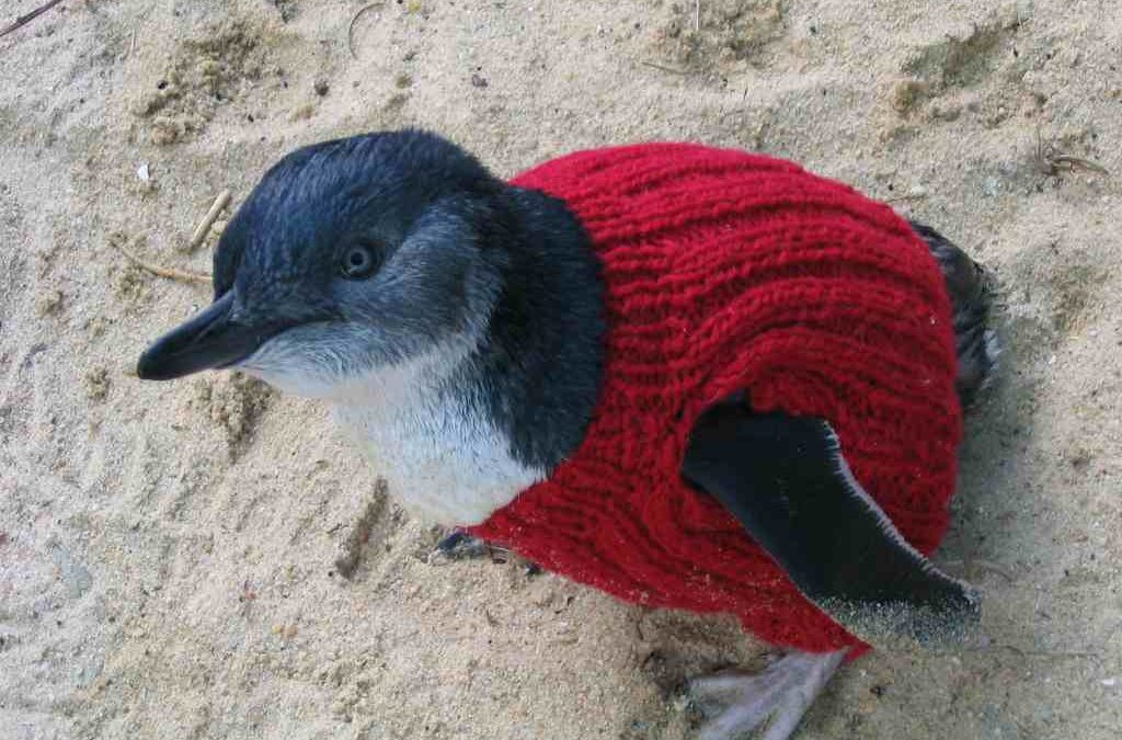 Pinguin im Strickpullover. Das künstliche Kleid kann im Ernstfall das Leben der Pinguine retten. Bild: Penguin Foundation.