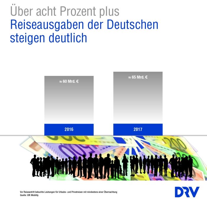Die Reiseausgaben der Deutschen vor Reiseantritt stiegen von 2016 auf 2017 um 5 Milliarden Euro auf 65 Milliarden Euro. Bild: DRV.