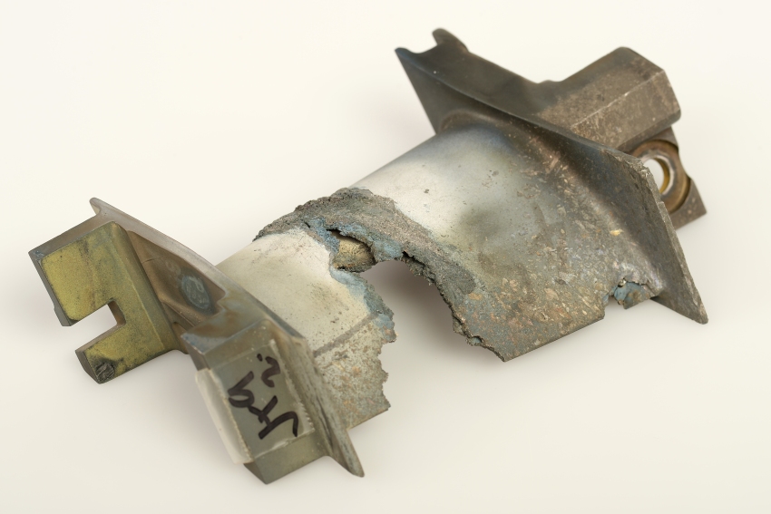 Vulkanasche schädigt Flugzeugtriebwerke hauptsächlich durch die von scharfkantigen Partikeln verursachte Erosion und durch geschmolzene Asche. Bild: DLR.