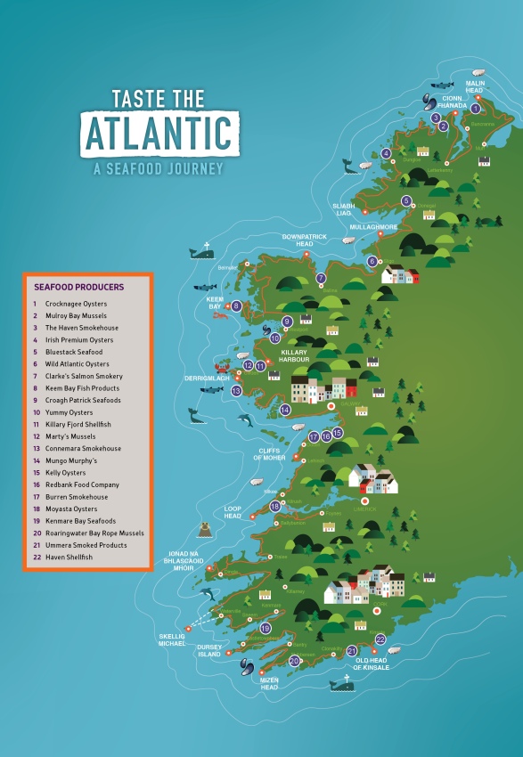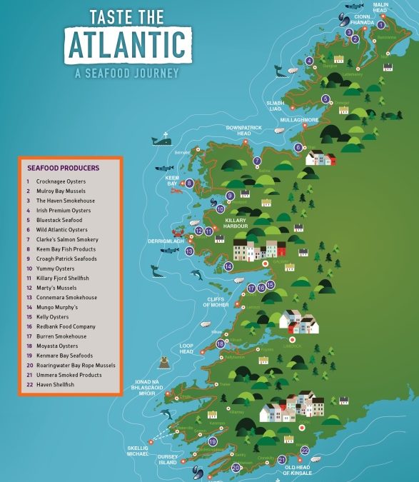 Die Seafood-Reise wird noch durch eine Vielzahl an Restaurants und Cafés bereichert, die sich auf fangfrischen Fisch und Schalentiere spezialisiert haben. Da wären als Delikatessen zunächst einmal die irischen Felsenaustern zu nennen wie auch am Seil gezüchtete Miesmuscheln und Venusmuscheln und immer wieder auch Hummer und biologisch gezüchteter Lachs. Die klaren sauberen Gewässer am Wild Atlantic Way geben die Schätze und den Geschmack des Meeres in Hülle und Fülle her und der neue Seafood Trail führt zu den besten Adressen.