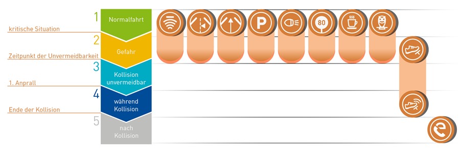 So zahlreich und unterschiedlich Verkehrsunfälle auch sind: Ihr Ablauf folgt in der Regel demselben Schema. ACEA, der europäische Dachverband der Automobilindustrie („Association des Constructeurs Europèens d’Automobiles“) hat einen schematischen Unfallablauf entwickelt, der den Hergang in fünf verschiedene Phasen einteilt (H. Winner, S. Hakuli, F. Lotz, C. Singer (Hrsg.), Handbuch Fahrerassistenzsysteme, ATZ/MTZ-Fachbuch, Wiesbaden 2015, S. 66.). Mit Hilfe dieses Modells kann man veranschaulichen, wann und wie Fahrerassistenzsysteme (FAS) bei der Vermeidung oder Abschwächung von Unfällen helfen können.