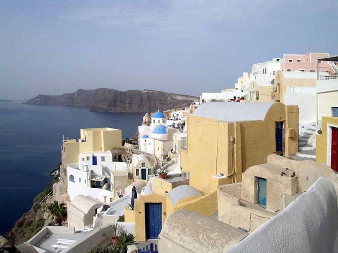 Wie auf den anderen Kykladeninseln ist auf auch Santorin, der südlichsten der Gruppe, Wasser eine Mangelware und das Landschaftsbild wird von nur spärlich bewachsenen Felsen geprägt. Dabei ist die Kargheit der Insel alles andere als erdrückend. Vor der Kulisse des strahlend blauen Himmels, der durch die gekalkten Wände der Häuser reflektiert wird, fühlt man sich in ein Griechenland versetzt, wie man es sonst nur aus den Bildern von Reisemagazinen kennt. Besonders stark ist dieser Eindruck in den Orten Thira und Oia. Thira, der Hauptort Santorins, liegt wie Oia direkt an der Kante der Steilküste. Seine Treppenwege erkundet man am Besten traditionell auf dem Rücken eines Maultiers oder, moderner, mit der Kabinenbahn. Spektakulär sind auf jeden Fall die Ausblicke, die man in beiden Städten auf die Caldera und das glitzernde Meer genießen kann.