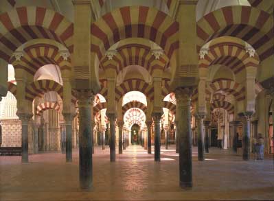 Der Innenraum der Moschee von Córdoba wird oft mit einem Palmenhain verglichen. Dieser optisch äußerst zutreffende Vergleich ruht auf den über 800, heute noch stehenden Säulen, die als Hufeisenbögen das Gerüst des einmaligen Gotteshauses tragen. Die gesamte Mezquita wirkt wie ein Ort der Ruhe und Beschaulichkeit, dessen -keinesfalls monotone- Wiederholung sich scheinbar endlos fortsetzt und so ein Gefühl von Raumlosigkeit im Raum erzeugt. Der Eindruck sich in einem Wald aus Palmen zu befinden, wird durch den farblichen Wechsel aus roten und weißen Steinen innerhalb der einzelnen Säulen zusätzlich verstärkt.