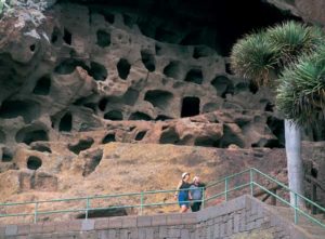 Die Cuevas de los Canarios an den Wänden des Kessels von Bandama bestehen aus verschiedenen Räumen und gemeinschaftlich genutzten Getreidespeichern. In den Höhlen sind Felsgravierungen zu sehen. Bei Santa Brigida.
