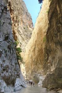 Ein wenig Mut gehört schon dazu, wenn man die Schlucht „erwandern“ will. Die ersten Meter über einen Steg, der über das auch im Sommer eiskalte Wasser des Flusses Xanthos führt, erscheinen noch ganz bequem, dann aber fängt das eigentliche Abenteuer erst an. Der weitere Weg führt entlang des sehr schmales Flussbettes und die meiste Zeit sogar mitten hindurch. Nasse Füße bekommt man auf jeden Fall und wer die Schlucht wirklich zu Fuß durchqueren möchte, sollte geeignetes Schuhwerk, das auch vor den Steinen im Fluss schützt, nicht vergessen. Im Verlauf des Weges wird die Schlucht immer schmaler und demzufolge die Fließgeschwindigkeit des Wassers auch im schneller. An manchen Stellen muß man durch hüfthohes Wasser waten. Die komplette Strecke sollten daher auch nur erfahrenen Wanderer mit einer guten Kondition in Angriff nehmen.